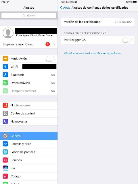 Ahora entraremos en Ajustes / General / Información /Ajustes de confianza de los certificados, tal y como se puede ver en la siguiente ventana, donde el certificado aun no es de confianza: